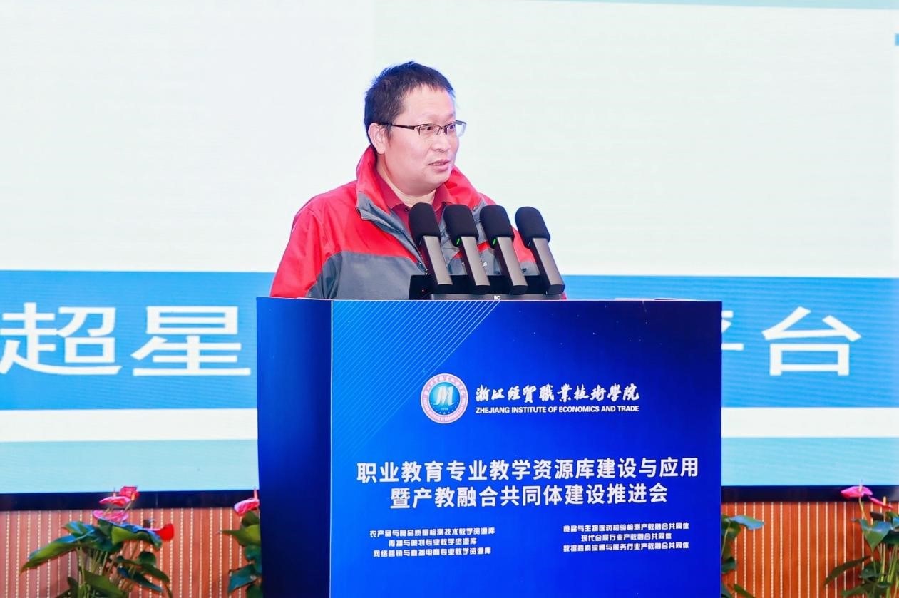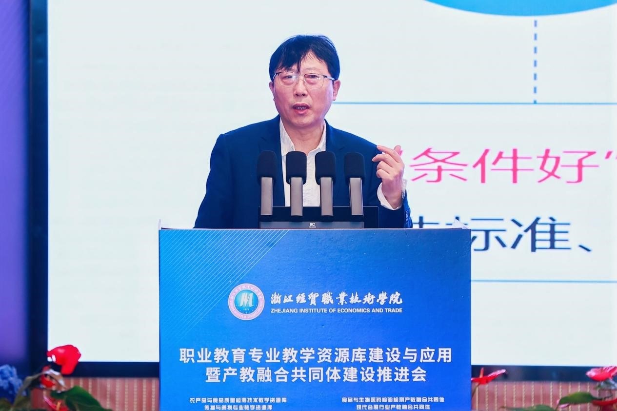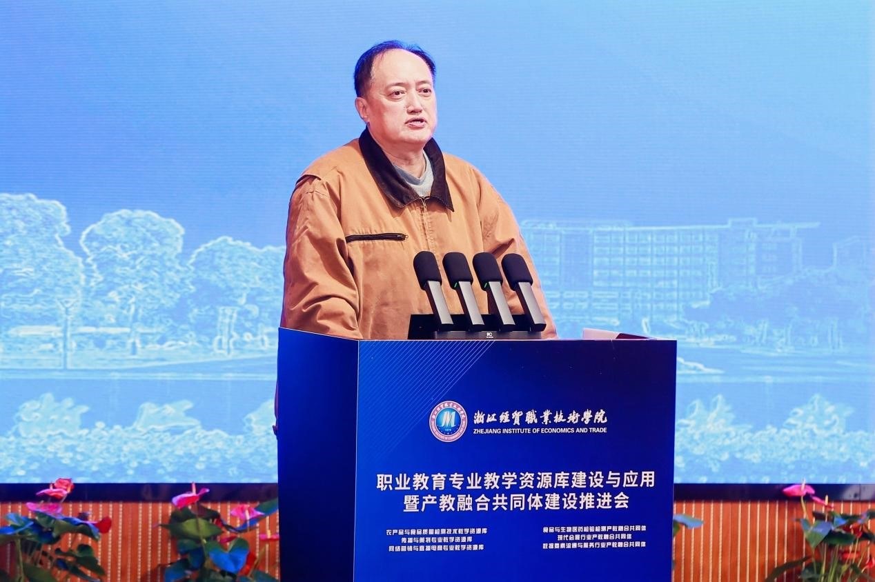 吴洪贵作题为《“服务好、支撑好”重点产业发展的“数智化、模块化”专业教学资源建设》的专题报告。报告结合“新双高”内在逻辑演变,阐述专业教学资源库在导向功能、遴选标准、实施方向、内涵建设等四方面的变化,并对新一轮专业教学资源库建设的关键要素、建设路径、保障机制等内容进行了全面分析。